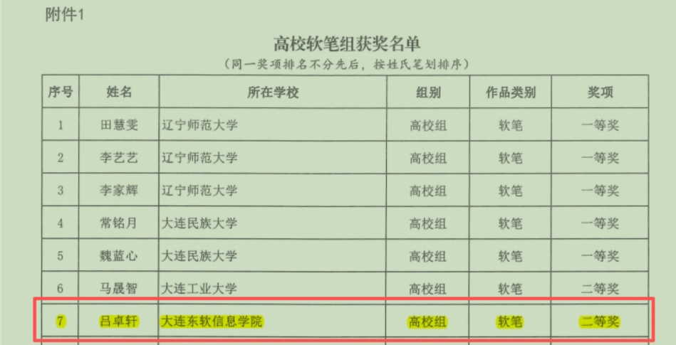 近日,由市委高校工委、市教育局联合主办的“书写雷锋精神助振兴攻坚大中小学生书法大赛”落下帷幕。我校学子在高校软笔组竞赛中表现优异,共斩获二等奖1名、三等奖1名、优秀奖1名。其中,我院日语专业2022级学生吕卓轩凭借扎实的书法功底与深刻的主题表达,成功摘得高校软笔组二等奖,为学校与学院赢得荣誉。