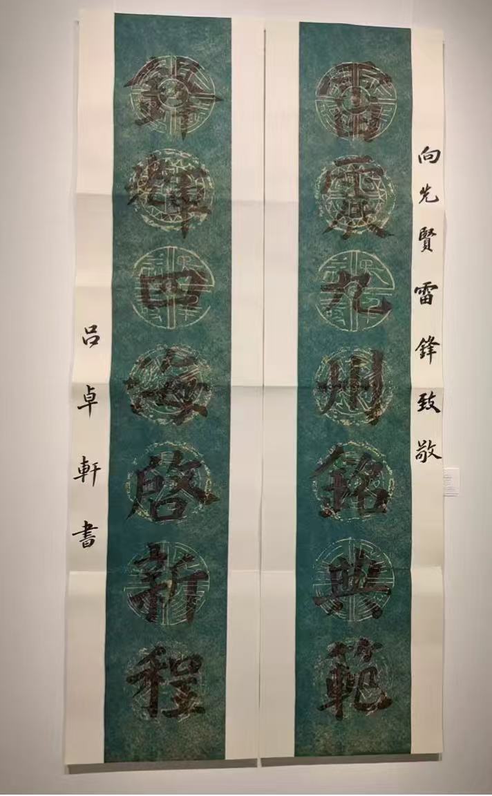很荣幸能在此次比赛中获得二等奖。我一直深爱着书法,沉浸在笔墨的世界里,感受线条与结构的魅力。这次创作对联“雷震九州铭典范,锋辉四海启新程”,我希望通过书法艺术,致敬雷锋同志。雷锋精神是永恒的灯塔,激励着无数人。于我而言,书写的过程也是对雷锋精神的学习与感悟,每一笔都饱含着我对传承雷锋精神的热忱,未来我会继续以笔为媒,让书法与雷锋精神相伴,不断前行。