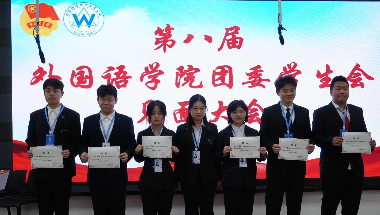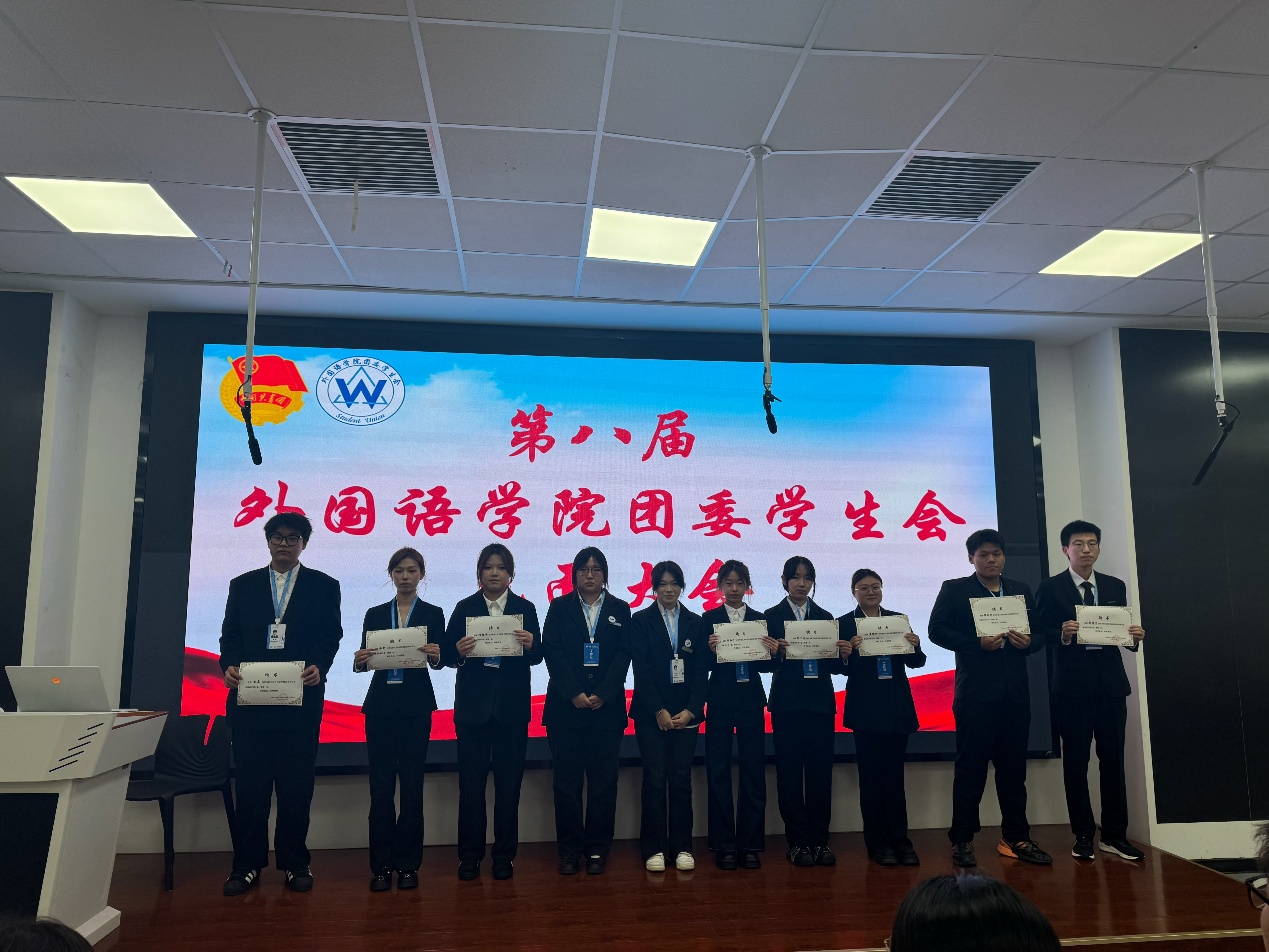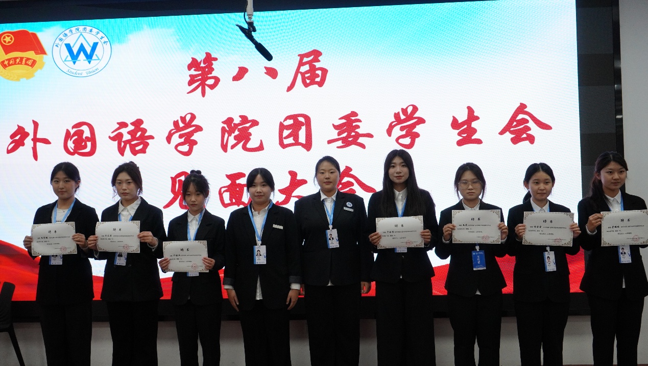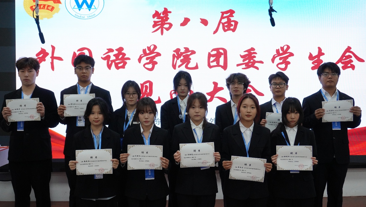 大会现场,外国语学院团委书记于思琦老师宣读新一届学生骨干任职名单并作总结讲话,为新征程注入指引与期许。接过证书的瞬间,不仅是身份的正式确认,更是组织信任与责任使命的传递。各部门部长、副部长亲自为骨干们颁发证书,见证这份光荣的交接。
