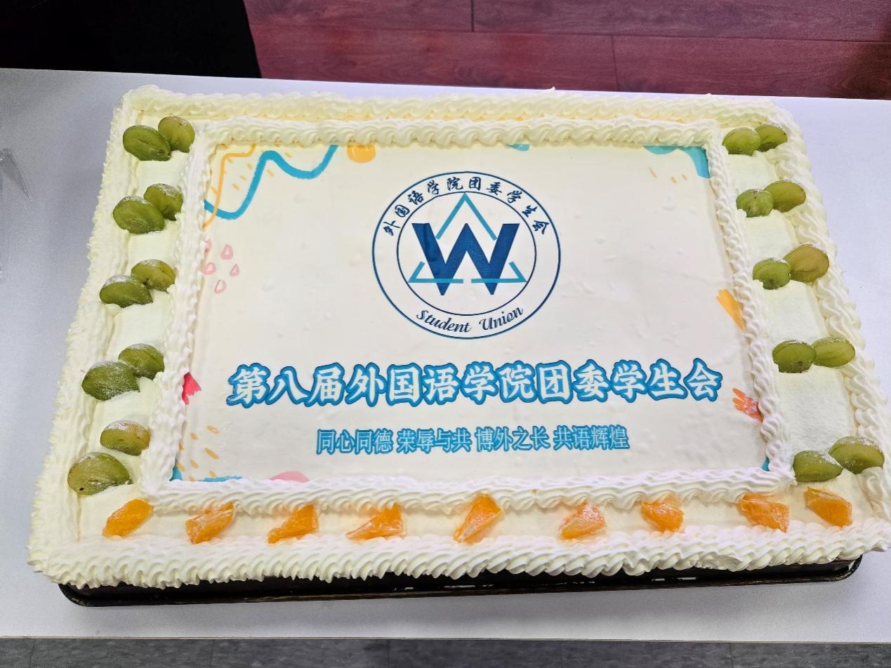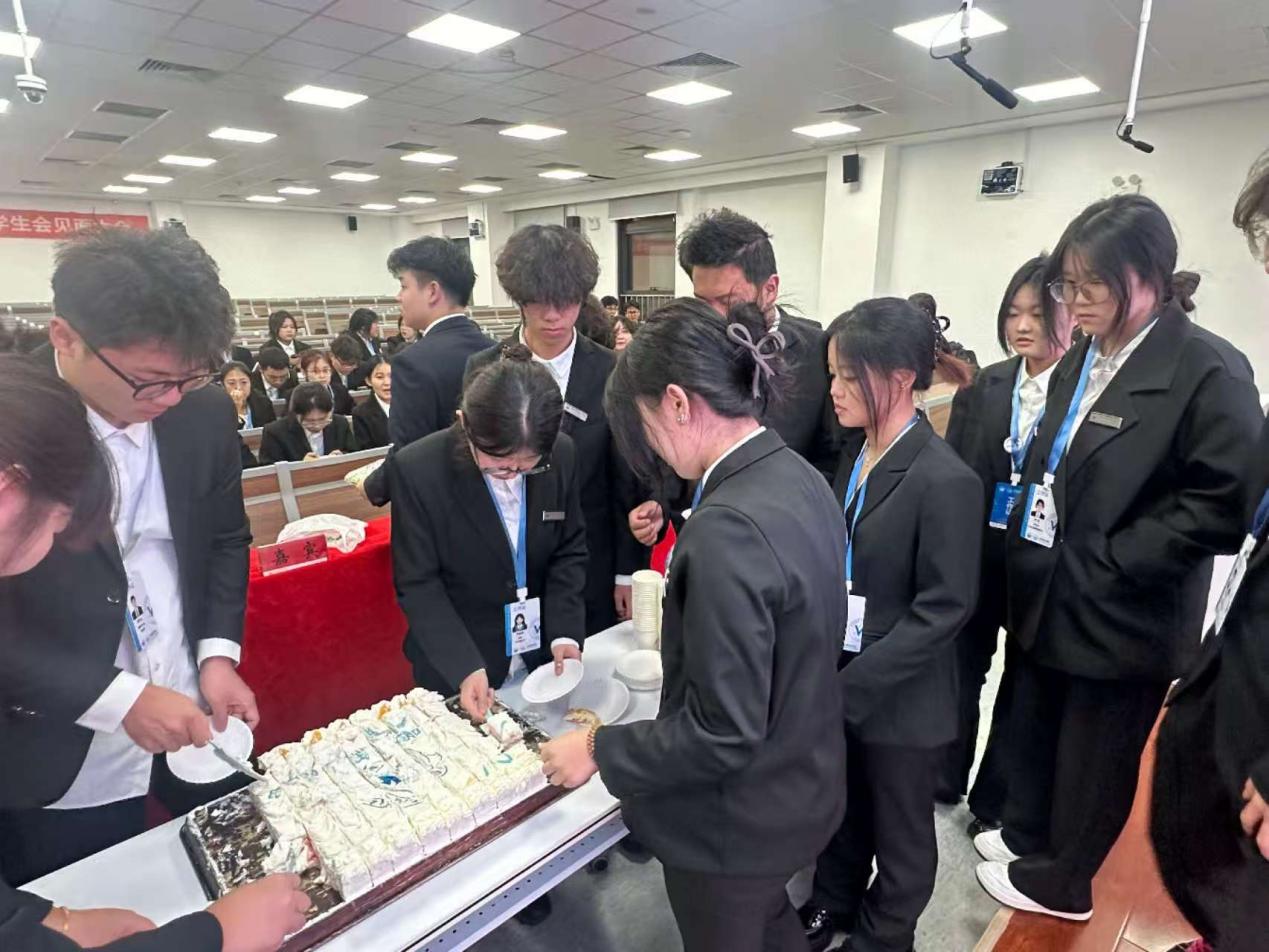 暖心收尾环节,精致的蛋糕缓缓推上,为每一位学生会成员送上甜蜜祝福。现场洋溢着“同心同德、荣辱与共,博外之长、共谱辉煌”的浓厚氛围,定格下属于这个集体的温暖瞬间。