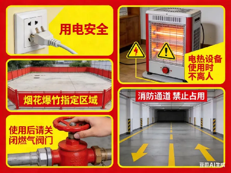 2、取暖设备人走电断,春节期间烟花爆竹请在规定区域燃放;
