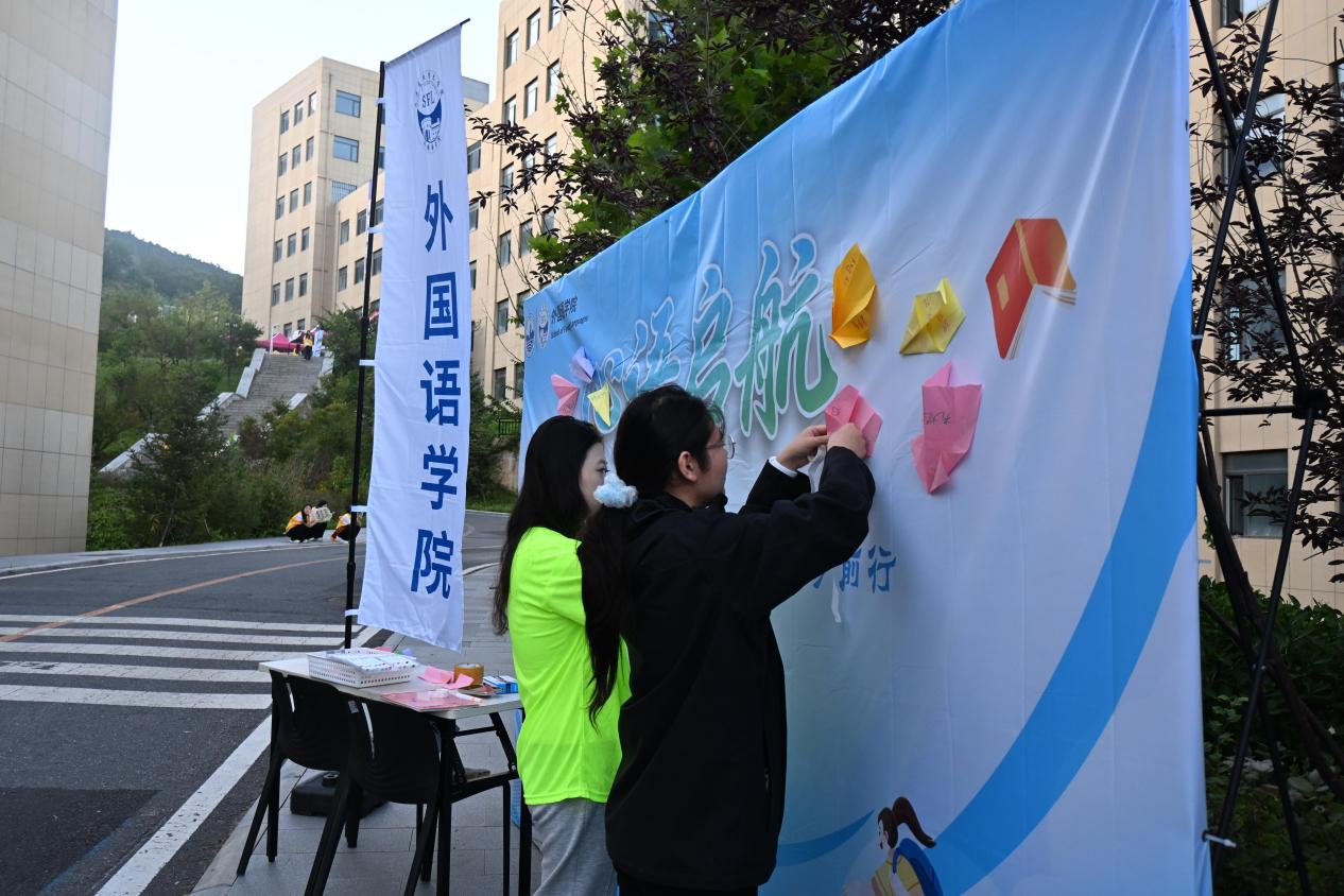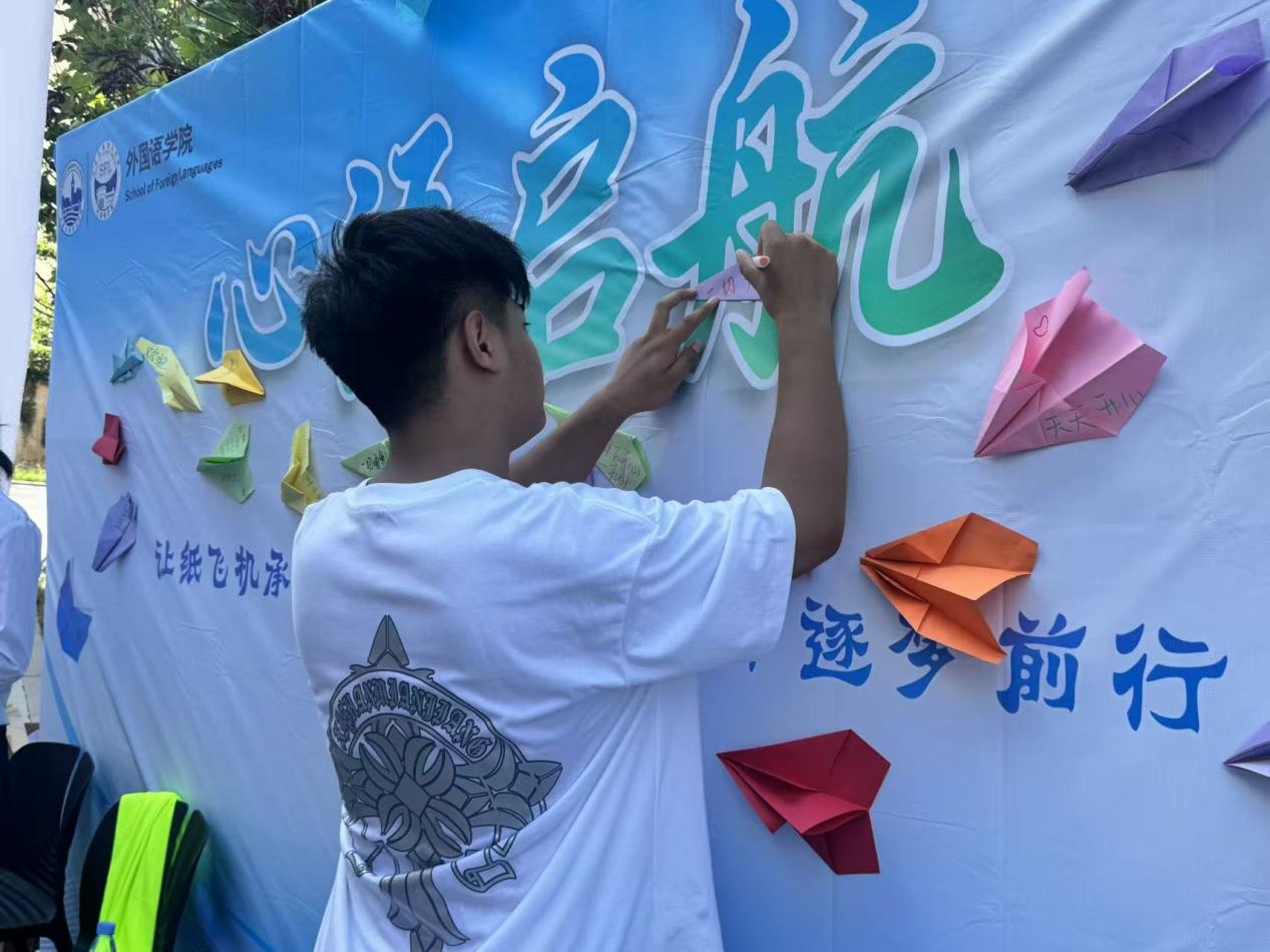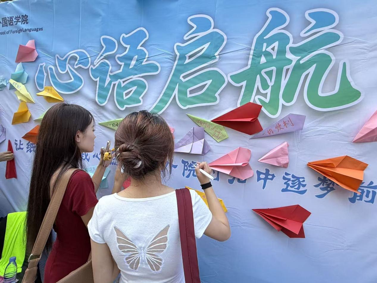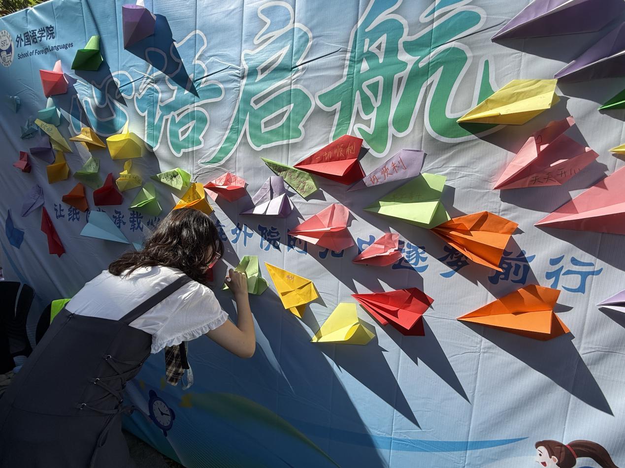 学院精心设置“外院‘初·见’——互动打卡集礼活动”,新生参与各打卡点互动可收集印章,集满指定数量印章还能有机会获得精美礼品。同时,新生可在彩色信纸上写下对大学四年的期待、目标或梦想,亲手折成载满初心的纸飞机并粘贴在专属签名墙上,汇聚成绚烂的“未来蓝图”;这一刻既是新生大学生涯的崭新起点,也是属于彼此、属于外院的温暖记忆,青春在此定格,梦想从这里启程。