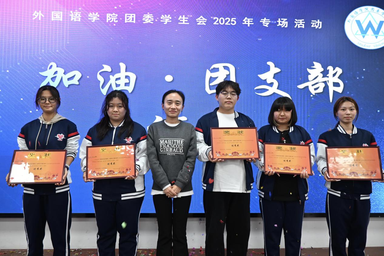 英语25001班团支部、英语25002班团支部、日语25003班团支部、日语25004班团支部、日语25005班团支部荣获优秀奖,素质教师郭清老师为获奖班级颁奖并合影留念。