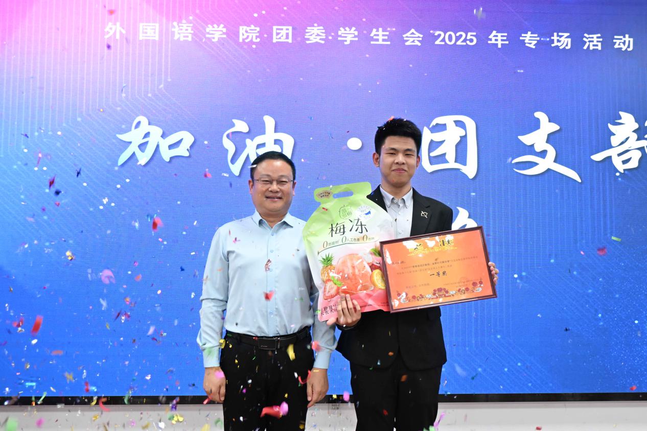 最终,日语25002班团支部凭借极具感染力的表演摘得一等奖,外国语学院党委书记王新明为其颁奖,见证这一荣耀时刻。