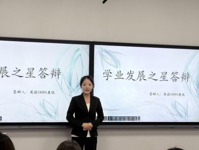 2025年秋季“学业发展之星”评选活动于近日展开,历时一个月。本次活动由英语25003班的班诗晨同学主持,向大家展现了大一学生的良好精神风貌。本次“学业发展之星”现场答辩环节还邀请了英语系专业教师郝玲老师、孙洋子老师、吴玲涛老师参与本次活动评审工作。同时作为大众评审的2025级英语系全体学生在现场观看了本次活动,并参与现场打分。
