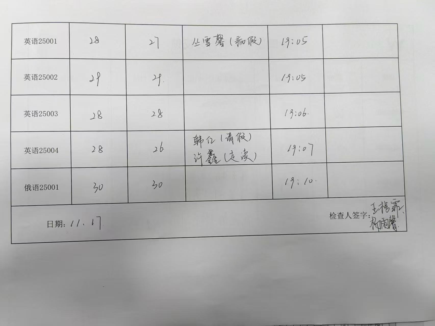 为守护这份纯粹的学习氛围,外国语学院团委学生会学习部的干事们,迎着清晨第一缕晨光,伴着深夜朦胧月色,每日坚守在早晚自习巡检岗位上,为同学们的学业之路保驾护航。