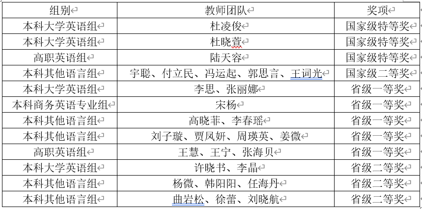 除3项全国特等奖外,我校日语与俄语教学部的宇聪老师团队还获得全国二等奖1项、另外还有8组教师团队获得省级一等奖5项、省级二等奖3项。名单如下: