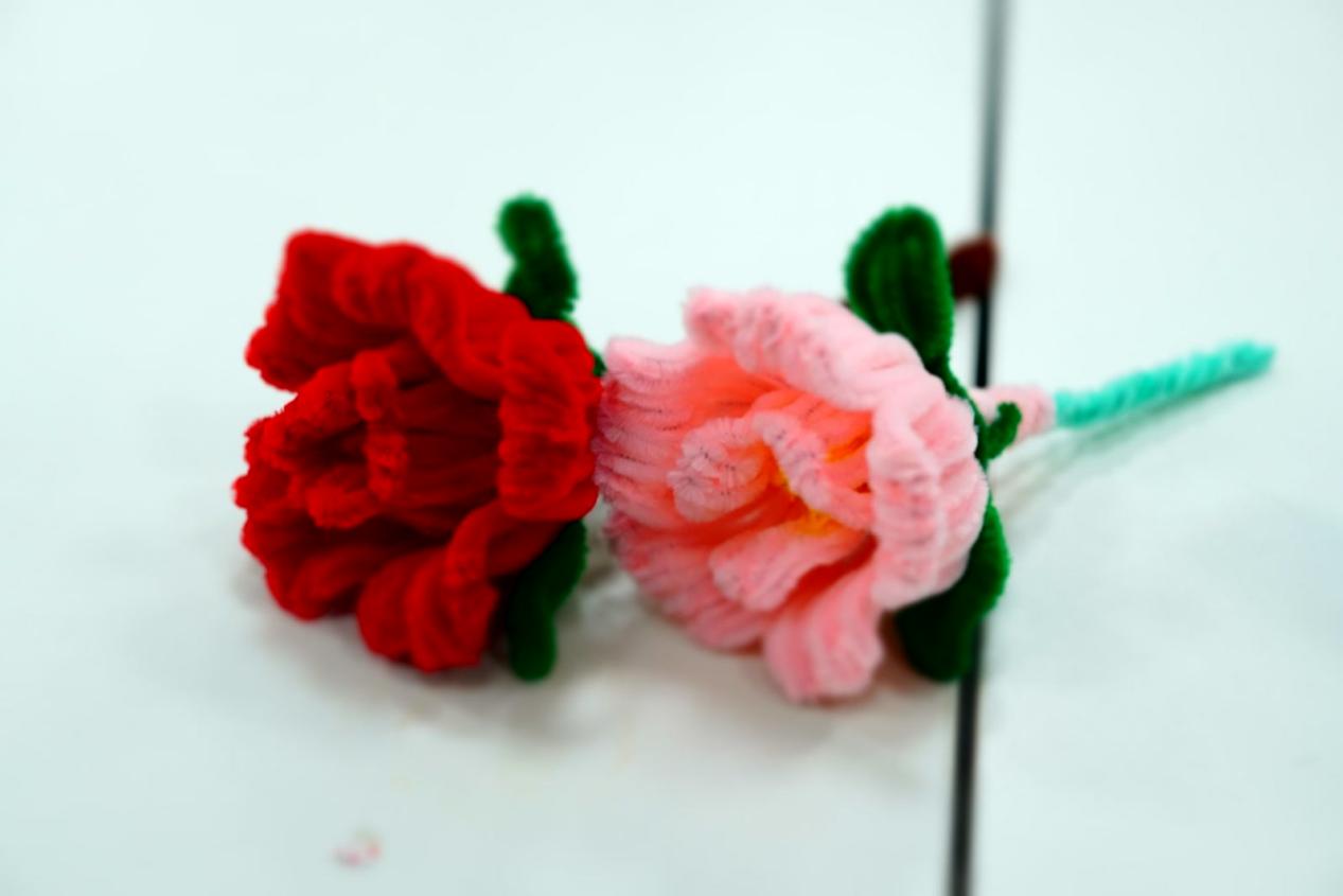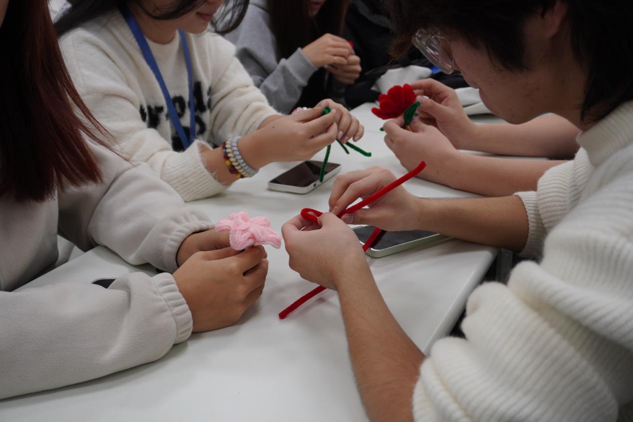 活动现场,同学们领取了五颜六色的扭扭棒材料包——这些看似简单的毛绒条,在大家的巧思与手指的配合下,逐渐“生长”成形态各异的作品。色彩斑斓的扭扭棒仿佛被赋予了生命。同学们或凝神思索,或轻声交流,手指间缠绕、弯折、拼接……原本线条简单的材料,逐渐在指尖盛放为灵动的玫瑰,充满爱意的手工工坊变成了玫瑰花的世界。