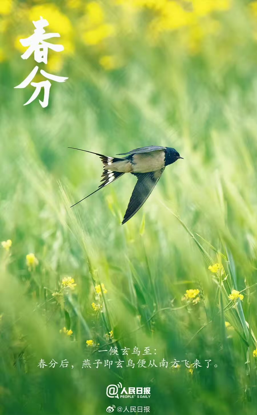 一候玄鸟至:玄鸟指燕子。春分回暖,燕子从南方飞回北方,衔泥筑巢,带来生机。